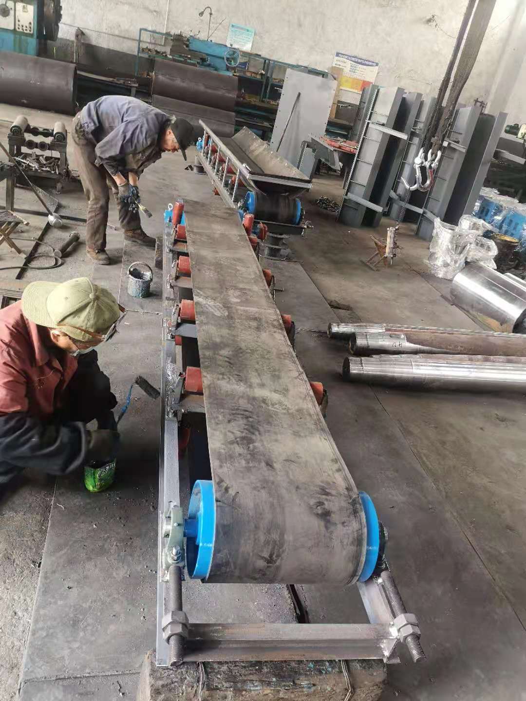 ?、拍z帶輸送機的牽引力是通過傳動滾筒與膠帶之間的摩擦力來傳遞的,因此須將膠帶用拉緊裝置拉緊,使膠帶在傳筒滾筒分離處具有一定的初張力。